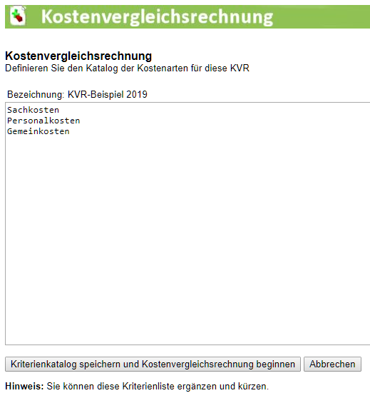 Kriterienkatalog speichern …: Klicken Sie auf diese Schaltfläche, wenn die Inhalte und die Struktur der Kostenvergleichsrechnung "stehen" und Sie mit der Eingabe der monetären Daten fortfahren wollen.