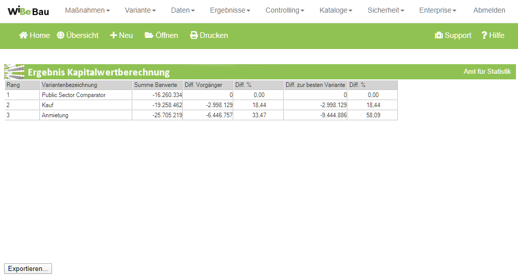 Ergebnis Kapitalwertberechnung | Zeigt die Kapitalwerte aller Varianten der Maßnahme | |