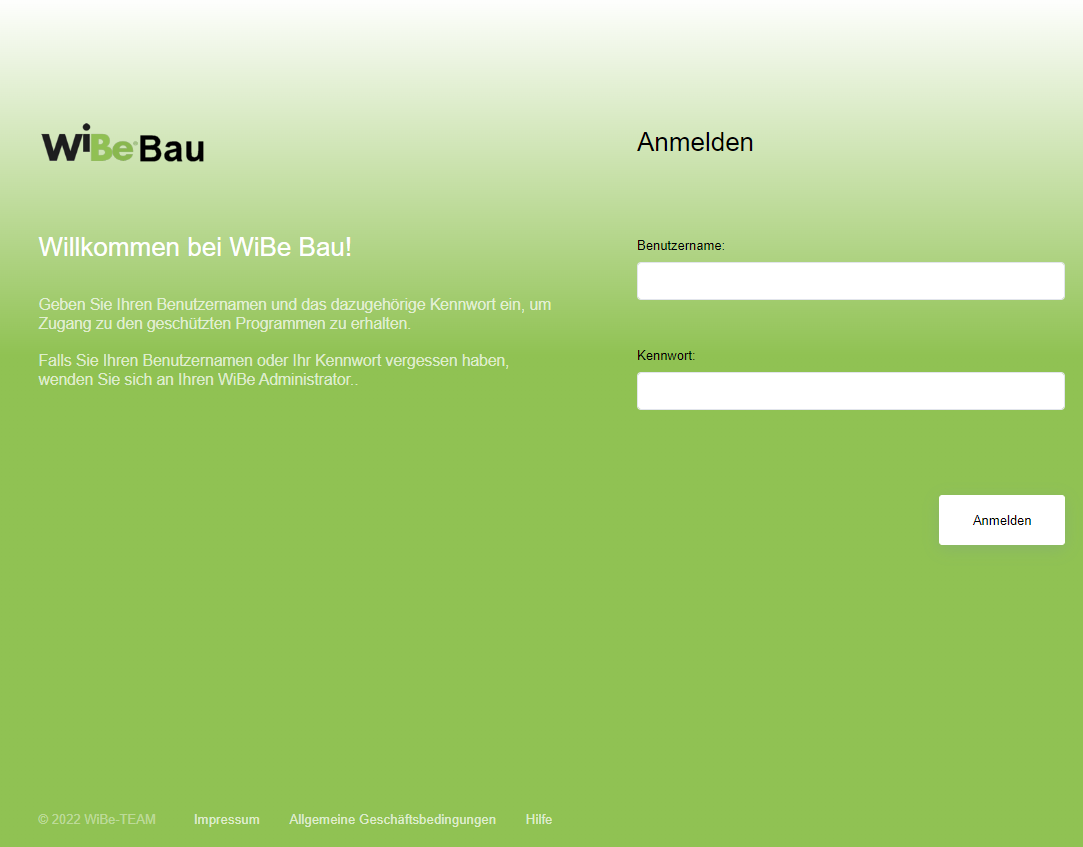 Sie benötigen Ihren Anmeldenamen und Ihr Kennwort, unter dem Sie sich am System anmelden. Diese Angaben erhalten Sie vom WiBe Bau Administrator.