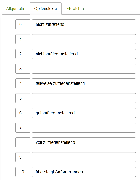 Sofern die Werte 0, 3, 7 und 10 im Katalog näher beschrieben sind, werden diese Texte am Bildschirm angezeigt, andernfalls wird nur eine Auswahlliste mit den Punkten 0 bis 10 dargestellt.