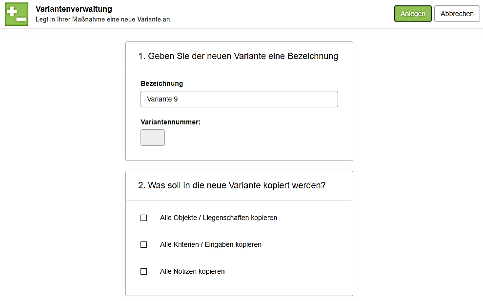 Varianten | Neue Variante | Neue Variante oder Objekte in der Maßnahme anlegen |