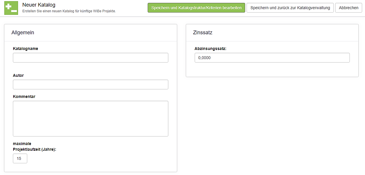 Hinweis: Kriterienkataloge legen fest, welche monetären Kriterien zur Bewertung einer Investitionsmaßnahme herangezogen werden sollen. Die in diesem Enterprise-Menü der WiBe genutzten Kataloge sind nicht identisch mit den "(Standard-)Kriterienkatalogen" des Fachkonzepts WiBe. Sie haben hier die Möglichkeit, eine Kostenvergleichsrechnung nach eigenen Vorgaben zu konfigurieren.