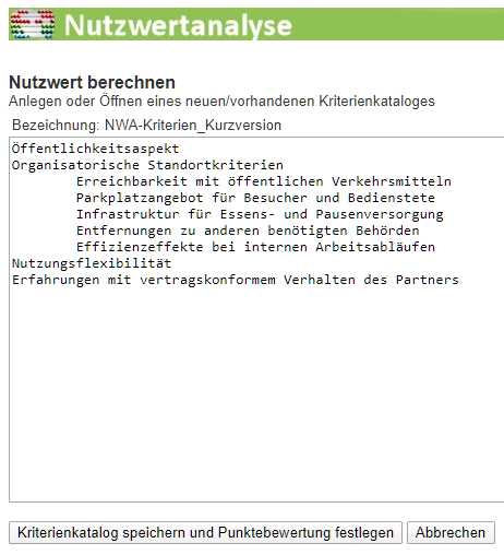 Katalogkriterien speichern und NWA-Projekt anlegen: speichert den Katalog und führt zum nächsten Schritt, der Anlage einer Nutzwertanalyse mit diesem Katalog.