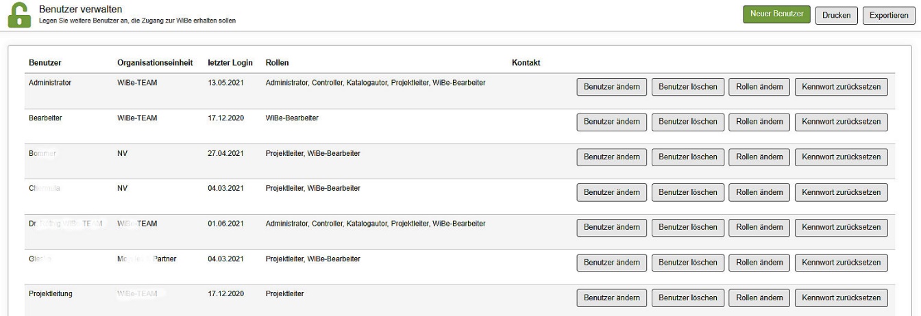 Die Tabelle mit der Spalte 'Benutzer' zeigt in alphabetischer Reihenfolge alle Benutzer dieser WiBe Installation mit weiteren Angaben (zugehörige Organisationseinheit, letzter Login, zugeteilte Rollen und (optional) Kontaktangaben).