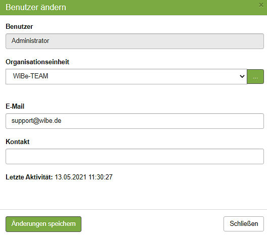 Mit Klick auf diese Schaltfläche öffnet sich der Dialog "Benutzer ändern" für den gewählten Benutzer. Sie können jetzt dessen Organisationseinheit oder eine neue Organisationseinheit definieren, die diesem Benutzer zugewiesen wird. Ebenfalls lassen sich Änderungen bei E‑Mail und den Kontaktdaten vornehmen.