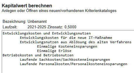 Mit dieser Schaltfläche übernehmen Sie Ihre Eingaben und gehen weiter zur Definition des Kriterienkataloges (als Grundlage der späteren Kapitalwertberechnung).