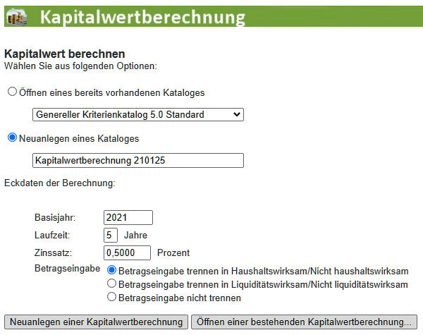 Im Menü 'Kapitalwertberechnung' können Sie Berechnungen mit der Kapitalwertmethode vornehmen. Ähnlich wie im WiBe-Konzept werden Ihre monetären Angaben in Barwerte umgerechnet und zu einem Kapitalwert saldiert.