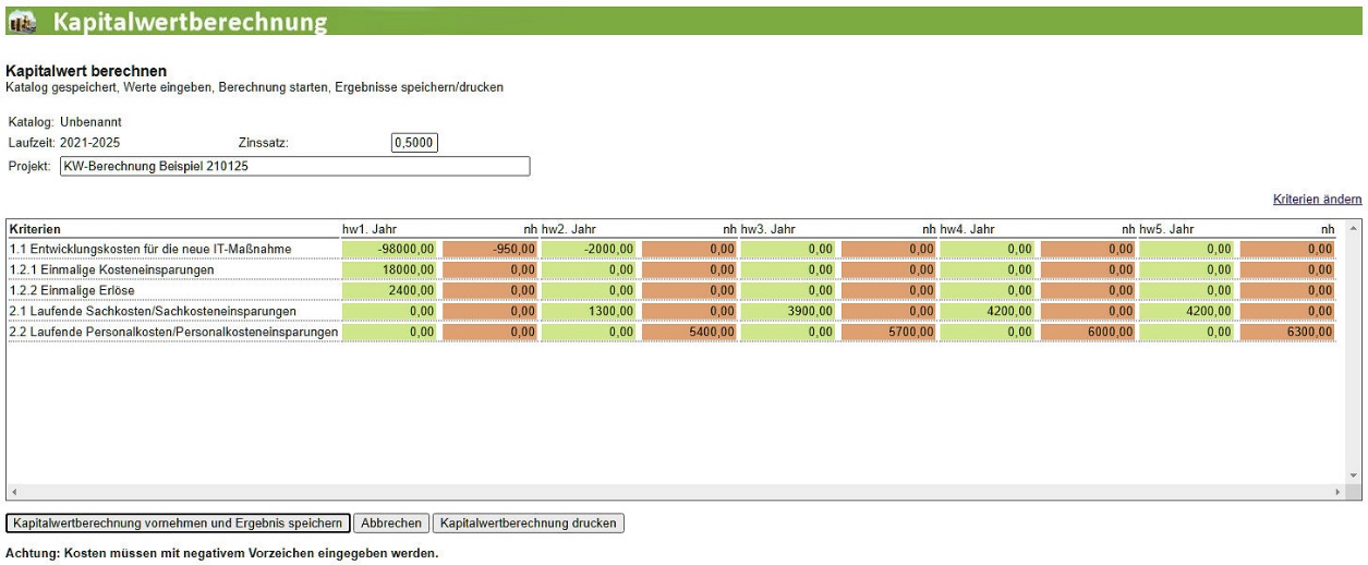 Nach der Definition des Kriterienkataloges für Ihre Kapitalwertberechnung werden Sie jetzt die monetären Werte in die Tabelle eingeben (Katalog und Laufzeit können nicht mehr geändert werden).