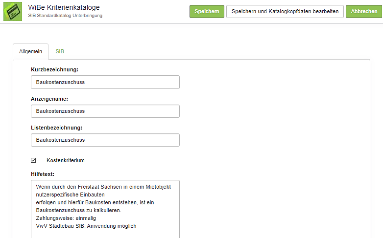 Mit dem Optionsfeld „VwV anwendbar“ wird festgelegt, ob bei diesem Kriterium eine Förderung nach der Verwaltungsvorschrift „Städtebau“ grundsätzlich möglich ist (die VwV Stufen dazu werden in den Kopfdaten des Kriterienkataloges im Registerblatt „SIB“ definiert).