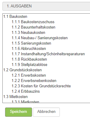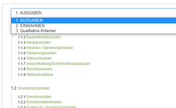 Hier wird für das Kriterium eine Zahlungsweise als Standard definiert (beispielsweise „einmalig“ beim Kauf einer Immobilie oder „monatlich“ bei Miete). Dem Anwender wird der Standard später bei der Betragseingabe vorgeschlagen, er kann davon abweichen und eine andere Zahlungsweise auswählen.
