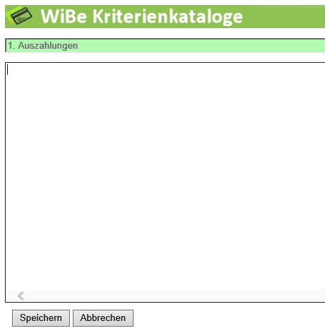 Verzichten Sie bei der Definition der Kriterien darauf, umfangreiche Texte mit Absatzumbrüchen aus anderen Anwendungen über die Zwischenablage einzufügen – aufgrund nicht sichtbarer Formatierungen kommt es je nach Anwendung und Webbrowser später zu unerwünschten Ergebnissen: die WiBe Anwendung prüft die Eingaben und lehnt in solchen Fällen die Speicherung ab.