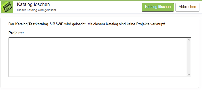 Sie erhalten eine Warnmeldung, falls sich Projekte mit diesem Katalog in der WiBe-Datenbank befinden und können den Vorgang abbrechen: