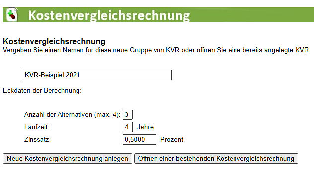 Im Menü 'Kostenvergleichsrechnung' können Sie Berechnungen mit der 'klassischen' Kostenvergleichsrechnung vornehmen und dabei bis zu vier Alternativen vergleichen. Sie gehen dabei in zwei Schritten vor: zuerst werden (nach Definition einiger Eckdaten) die Kriterien definiert, für die im zweiten Schritt monetäre Angaben zu machen sind.