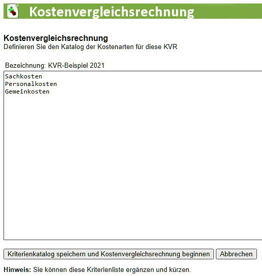 Kriterienkatalog speichern …: Klicken Sie auf diese Schaltfläche, wenn die Inhalte und die Struktur der Kostenvergleichsrechnung "stehen" und Sie mit der Eingabe der monetären Daten fortfahren wollen.