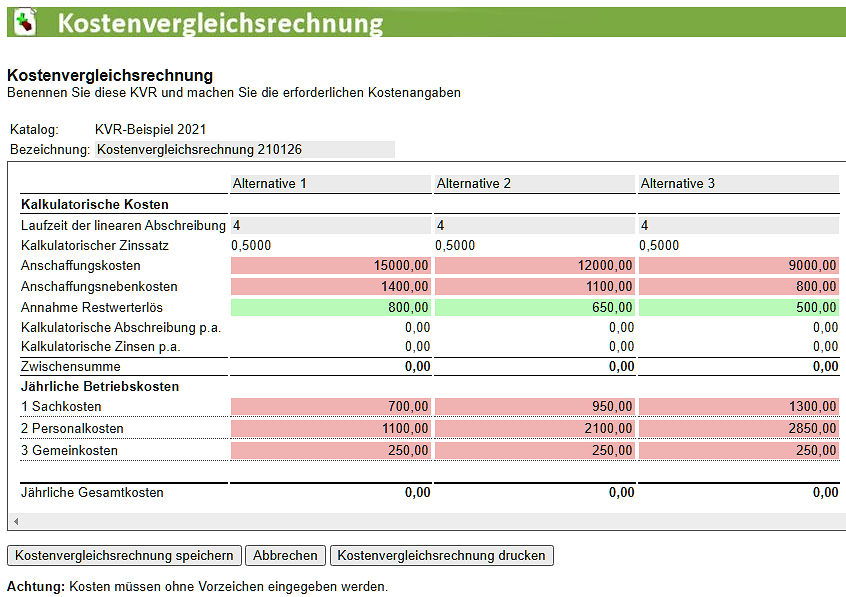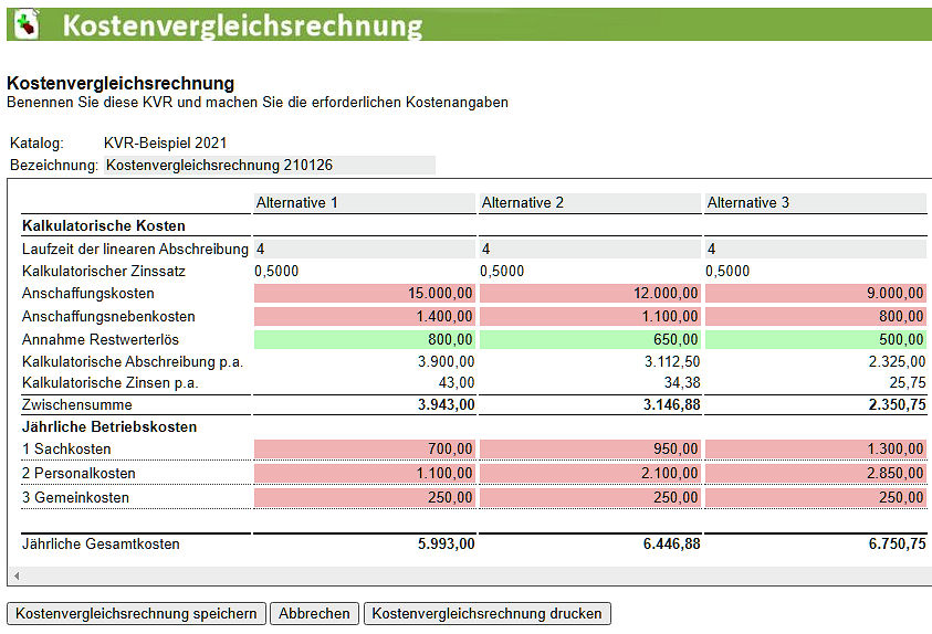 Wenn alle Beträge eingetragen sind, ist die Kostenvergleichsrechnung (fast) abgeschlossen. Die 'Jährlichen Gesamtkosten' werden angezeigt, wenn die Schaltfläche " Kostenvergleichsrechnung speichern" betätigt wurde.