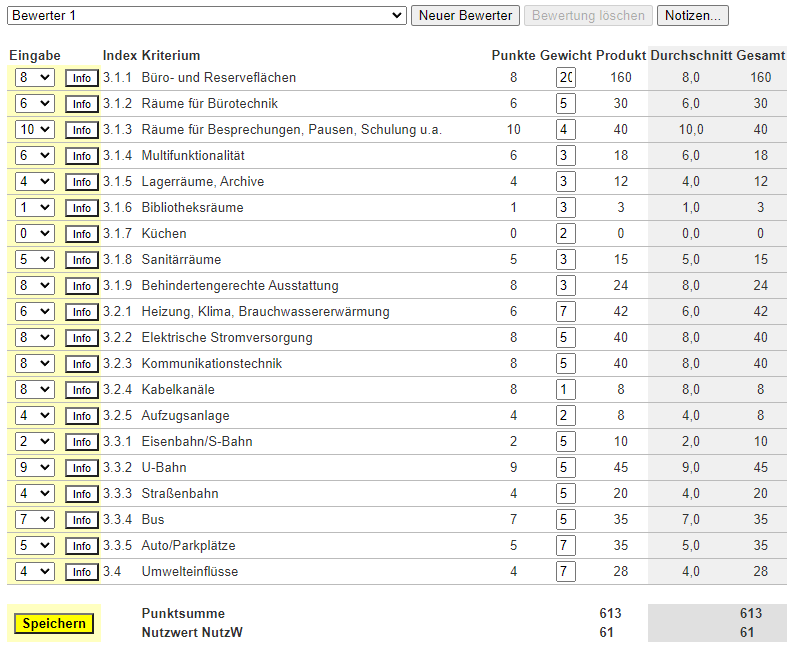 In den grau unterlegten Spalten "Durchschnitt" und "Gesamt" werden dann die Nutzwertbewertungen aller Bewerter dargestellt.
