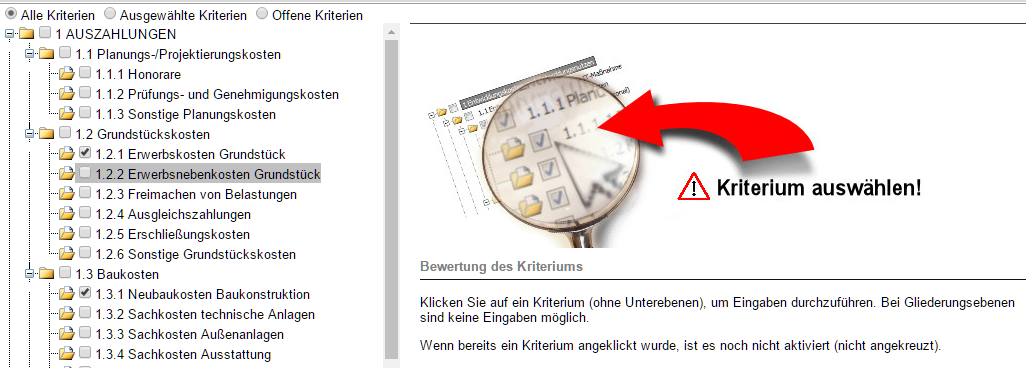 Monetäre Kriterien wählen Sie durch Anklicken einzeln oder als Gruppe aus der Kriterienliste aus. Die qualitativen Kriterien (am Ende des Kataloges) wählen Sie insgesamt als Block aus – es sind also automatisch alle qualitativen Kriterien aktiviert.