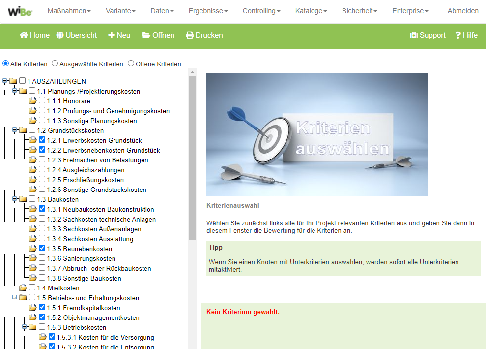Im linken Segment werden alle Kriterien des Kriterienkataloges in einer Baumstruktur dargestellt. Durch Anklicken des Kästchens vor der Kriteriennummer aktivieren bzw. deaktivieren Sie die gewünschten Kriterien. Wenn Sie einen Knoten mit Unterkriterien auswählen, werden auch alle Unterkriterien (de-) aktiviert. Nur aktivierte Kriterien stehen für die Berechnung der Wirtschaftlichkeit zur Verfügung. Wenn Sie "nur" den Namen eines Kriteriums anklicken, wird Ihnen der Informationstext zu diesem Kriterium im Informationssegment rechts unten angezeigt.