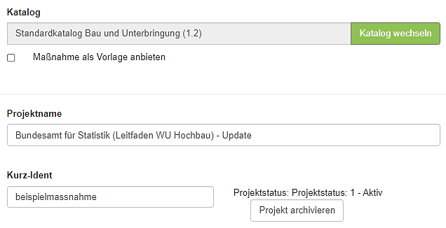 Im Anzeigefeld wird der bei der Neuanlage der Maßnahme gewählte Kriterienkatalog angezeigt. Daneben finden Sie die Schaltfläche "Katalog ändern". Die Option werden Sie nur in Ausnahmefällen verwenden. Sie können damit nachträglich den Kriterienkatalog einer bestehenden Maßnahme austauschen. Bereits eingegebene Werte bei identischen Kriteriennummern werden übernommen. Sie können so (Text‑) Änderungen eines Kriterienkataloges ohne großen Aufwand auf bestehende Maßnahmen anwenden. Da dies nur in seltenen Fällen zur Anwendung kommt, haben wir nähere Details dazu an das Ende dieses Abschnittes platziert (s. unten).