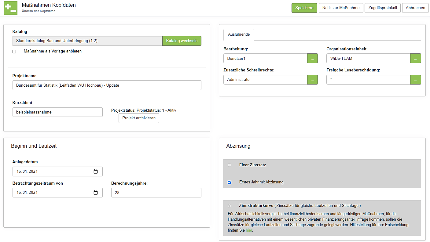Berechnungsjahre: Gibt die Anzahl der Jahre an, für die die Wirtschaftlichkeitsberechnung durchgeführt werden soll. Zulässig sind derzeit Eingaben zwischen 1 und 50 Jahren bei Verwendung des Standardkataloges Bau und Unterbringung (Kataloge können eine Laufzeit bis zu 999 (!) Jahren vorsehen). Die Anzahl der Berechnungsjahre ist für jede Maßnahme individuell zu bestimmen, sie soll sich an der geplanten Nutzungsdauer der Maßnahme orientieren. Eine Änderung der Berechnungsjahre ist innerhalb der Grenzen des Kriterienkataloges möglich.