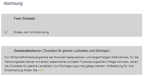 Bei der Neuanlage einer Maßnahme (und nur dann) kann entschieden werden, die Kapitalwertberechnung nicht mit festem Zinssatz (dem Standardfall), sondern mit der Zinsstrukturkurve vorzunehmen. Eine Änderung später ist nicht möglich.