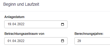 Betrachtungszeitraum gibt das Datum an, an dem mit der Maßnahme (im Sinne eines zu bearbeitenden Projektes) begonnen wird: dieses Datum ist das früheste, für das Kostenströme eingegeben werden können; Sie können dies überschreiben. Es ist gleichzeitig immer der sog. Stichtag für die gesamte Maßnahme, auf den alle Barwertberechnungen erfolgen.