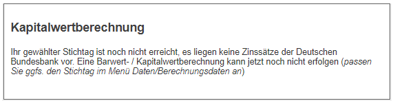 Hinweis zu "Zinsstrukturkurve": nachträgliche Anpassungen des Stichtages für die Anwendung der Zinsstrukturkurve sind möglich, sie beziehen sich auf die Maßnahme insgesamt mit allen Varianten. Diese Anpassungen können Sie im Menü 'Daten' unter 'Berechnungsdaten' vornehmen.