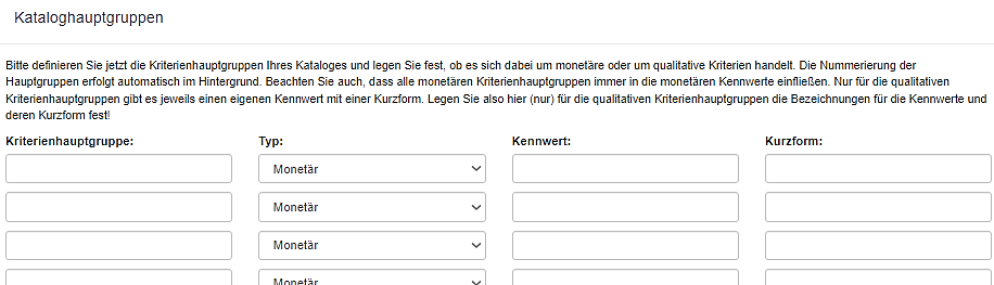 Kriterienkataloge legen fest, welche monetären (quantitativen) oder qualitativen Kriterien zur Bewertung einer Maßnahme herangezogen werden können. Sie können weitere Kataloge definieren, um auch für andere Projektarten die Wirtschaftlichkeit berechnen zu können.