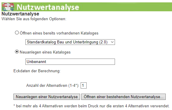 Geben Sie eine Zahl zwischen 1 und maximal 4 ein, damit die Nutzwerttabelle die gewünschte Anzahl an Alternativen darstellt. Sofern Sie mehr als 4 Alternativen bewerten wollen, setzen Sie den Wert auf 4 und verwenden den Kriterienkatalog für mehrere Nutzwertberechnungen mit jeweils anderer Bezeichnung.