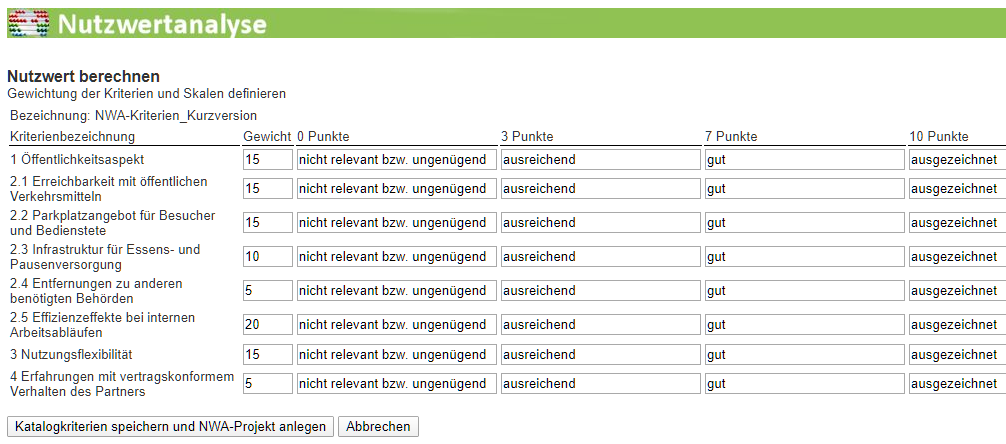 Wenn sowohl die Gewichte als auch (optional) die Punktwerte definiert sind, liegt ein "gebrauchsfertiger" Kriterienkatalog vor. Sie können diesen Katalog speichern und danach verwenden.