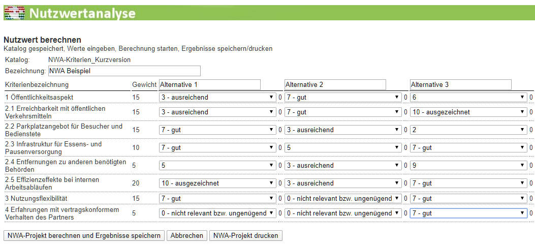 Wenn alle Punktwerte vergeben sind, ist die Nutzwertanalyse (fast) abgeschlossen. Die Nutzwerte werden angezeigt, wenn alle Benotungen vorliegen und die Schaltfläche "NWA-Projekt berechnen…" betätigt wurde.