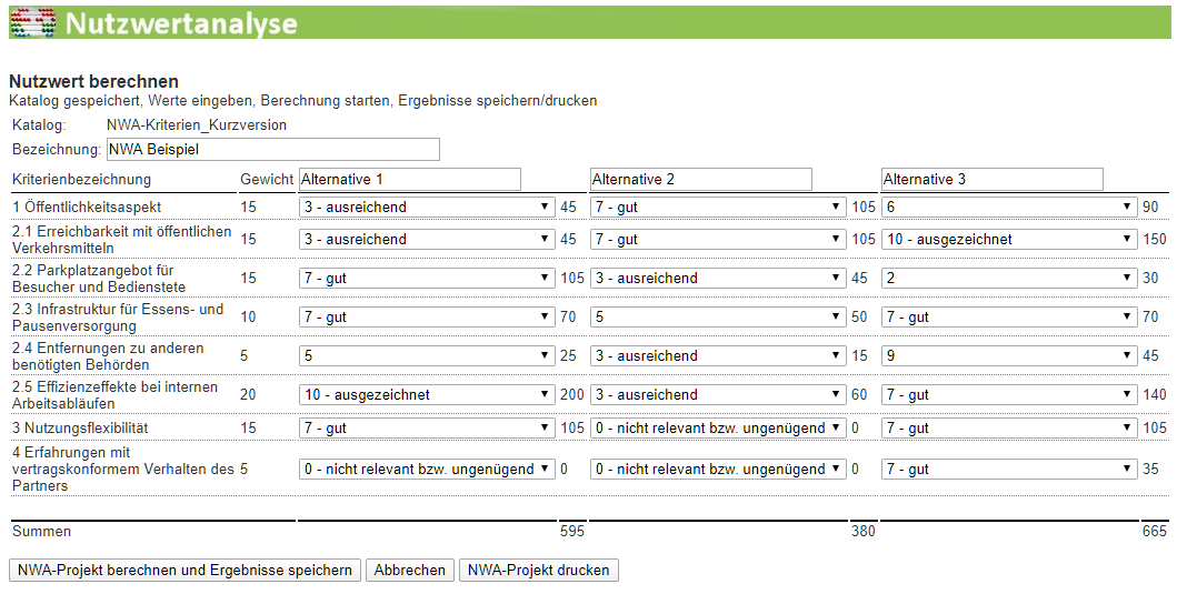 NWA-Projekt berechnen und Ergebnisse speichern: Klicken Sie auf diese Schaltfläche, um Ihre Bewertungen zu speichern und um die Berechnung der Nutzwerte vorzunehmen. Die Nutzwerte werden Ihnen dann in einer Summenzeile unterhalb der Nutzwerttabelle angezeigt. Die Alternative mit dem höchsten Wert ist die "beste".