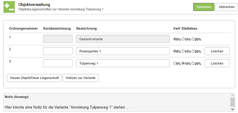 Mit der Schaltfläche "Notizen zur Variante" legen Sie eine Notiz an, mit der Sie Details zu allen Objekten dokumentieren können. Beachten Sie dabei: Details zur aktuellen Variante und zu allen Objekten dieser Variante werden in einer einzigen Notiz gespeichert. Wenn die Notiz (zur Variante oder zu Objekten) bereits existiert, wird sie Ihnen später in dem Anzeigefeld unterhalb der "Speichern" Schaltfläche angezeigt. Mit Klick auf "Notizen" können Sie die Notiz erneut aufrufen und bearbeiten.