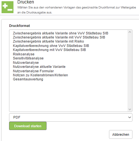 Das Drucken aus einer Web-Anwendung über den Druckbefehl des Webbrowsers kann zu unerwarteten Formatierungen führen. Alle Druckformate der WiBe sind deshalb vorgegeben und auf den Download und Druck als PDF-Datei optimiert.