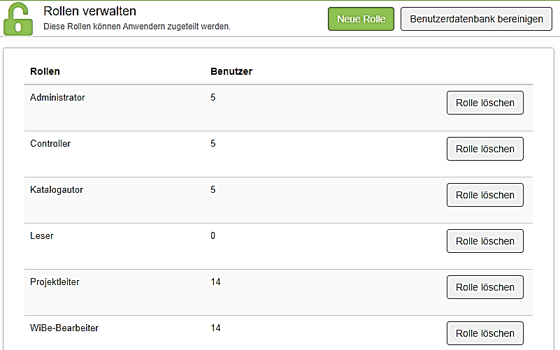 Hier hätten Sie auch die Möglichkeit, Rollen zu löschen (technisch möglich, aber nicht sinnvoll) oder weitere Rollen einzurichten (technisch möglich, nur sinnvoll zu einem späteren Zeitpunkt bei Erweiterungen der Software).