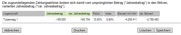Im Beispiel zeigt sich, dass sich der variierte Zahlungsstrom (nur) auf das Objekt Tulpenweg 1 der Vergleichsvariante bezieht. Die Berechnung ergibt: