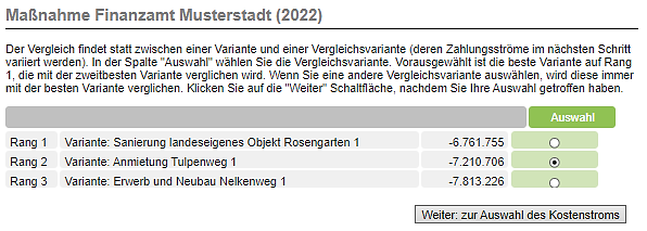 Der Vergleich findet statt zwischen einer Variante und einer Vergleichsvariante (deren Zahlungsströme im nächsten Schritt variiert werden). In der Spalte "Auswahl" wählen Sie die Vergleichsvariante. Vorausgewählt ist die beste Variante auf Rang 1 (im Beispiel Variante Sanierung), die mit der zweitbesten Variante (im Beispiel Variante Anmietung) standardmäßig verglichen werden soll.