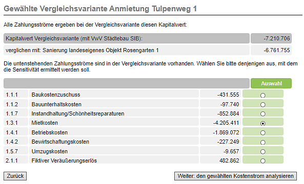 Wählen Sie jetzt durch Anklicken in der Spalte 'Auswahl' denjenigen Zahlungsstrom, für den die Sensitivitätsanalyse durchgeführt werden soll (im Beispiel: Mietkosten).