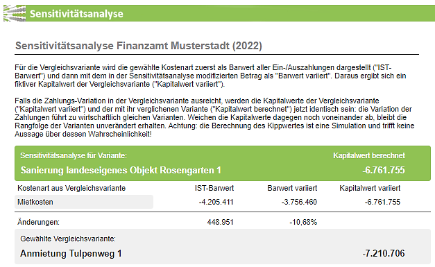 Wenn der Barwert der Mietkosten der Variante Anmietung (Vergleichsvariante) von derzeit 4.205.411 um 10,68 % weniger negativ ausfallen würde, dann wären die Varianten Anmietung und Sanierung (verglichene Variante) wirtschaftlich gleichwertig.