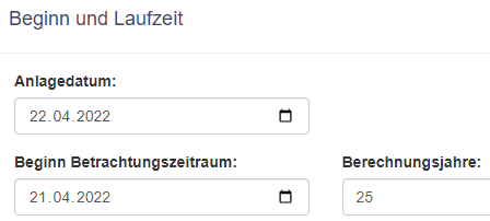 Geben Sie im Kasten "Beginn und Laufzeit" das Anlagedatum, den Beginn des Betrachtungszeitraumes und die Anzahl der Berechnungsjahre ein. Sie können die bereits eingetragenen Werte überschreiben oder übernehmen. Der Stichtag ist immer identisch mit dem Beginn des Betrachtungszeitraumes.