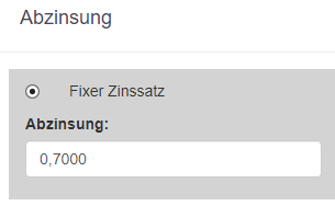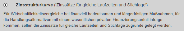 Im Kasten Abzinsung wird der Zinssatz angezeigt, mit dem später die Barwerte zu den Kostenströmen berechnet werden. Dieser Zinssatz wird vom Administrator für alle Anwender verbindlich im Kriterienkatalog hinterlegt. Sie werden diesen Wert nur in begründeten Fällen ändern.