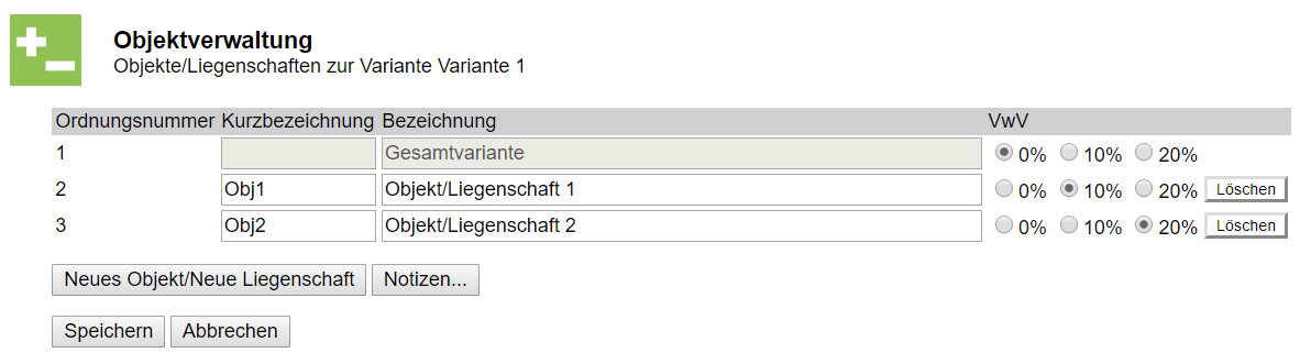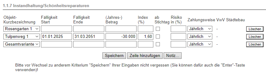 Eine Zeile (im Regelfall die erste) lautet immer „Gesamtvariante“ und zwar unabhängig davon, ob bereits weitere Objekte für diese Variante angelegt wurden oder nicht. Ihre Eingaben in dieser Zeile beziehen sich auf die Variante insgesamt.