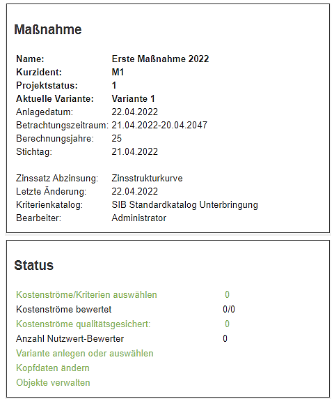 Sie können jetzt beispielsweise weitere Varianten oder Objekte innerhalb einer Maßnahme anlegen („Variante anlegen oder auswählen“ bzw. "Objekte verwalten") oder die Kopfdaten der Maßnahme ändern/ ergänzen („Kopfdaten ändern“) oder Sie lassen sich Details Ihrer Maßnahme im Menü „Ergebnisse“ anzeigen.