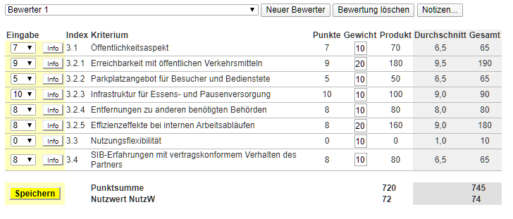 Nachdem die Eingaben gespeichert wurden, sehen Sie im rechten Teil der Maske das Ergebnis (Punkte, Gewicht, Produkt und den daraus folgenden Nutzwert) des betreffenden Bewerters.