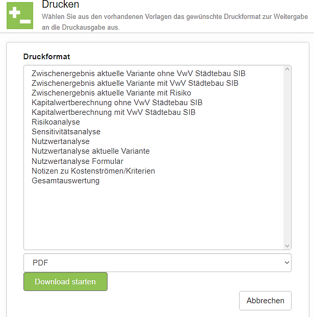 Hinweis: Im Menü 'Drucken' finden Sie das Druckformular "Nutzwertanalyse Formular", mit dem ein Formular als PDF erzeugt und sodann in der gewünschten Anzahl gedruckt werden kann. Die Formulare dienen zur Einholung von Nutzwert-Bewertungen.
