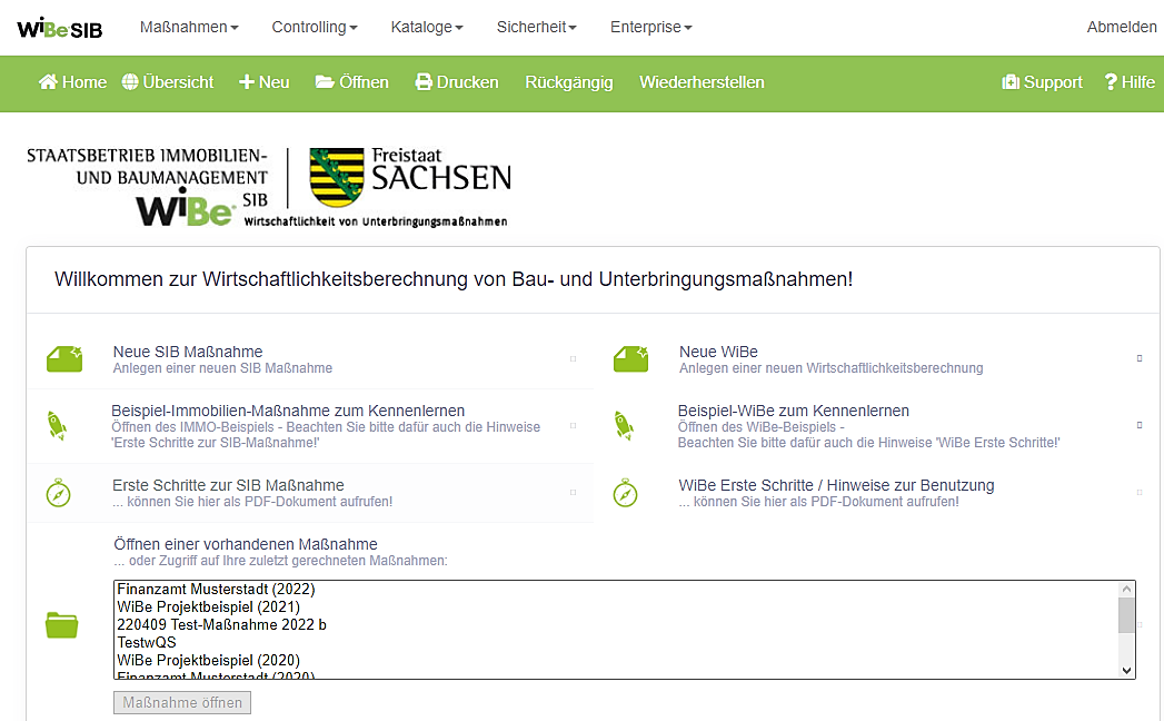 Nach der Anmeldung öffnet sich der WiBe Startbildschirm („Home“):