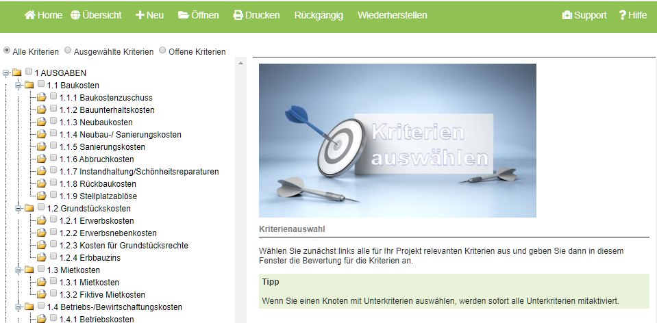 Standardmäßig werden Sie jetzt Kriterien auswählen, indem Sie im Übersichts-Bildschirm auf den Link Kostenströme/Kriterien auswählen klicken oder im Menü "Daten" dort "Daten eingeben" wählen. Sie gelangen damit in den Dialog zur Auswahl der Kriterien (Kostenströme), mit dem Sie die Werte eingeben können.