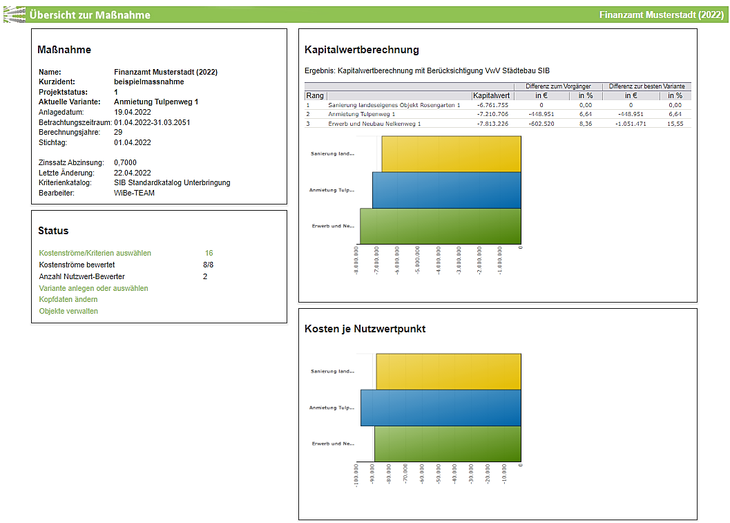 rechte Säule oben: monetäre Berechnungsergebnisse (Kapitalwert)