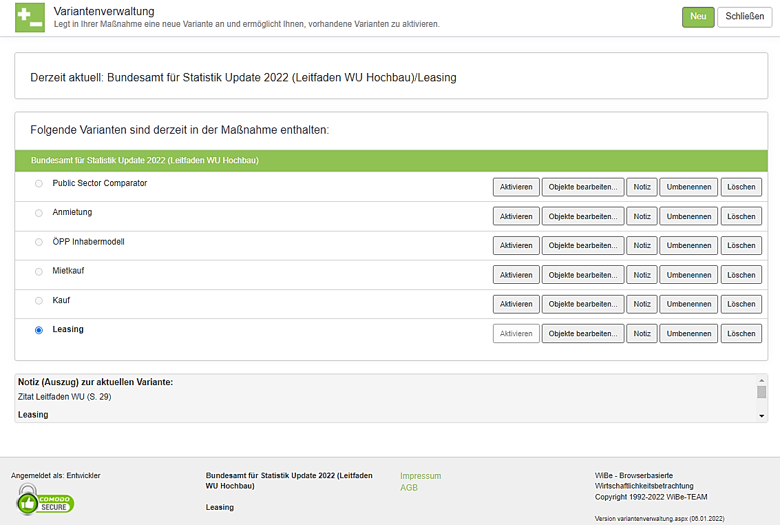 Durch Betätigen der Schaltfläche ‚Aktivieren' schalten Sie auf die betreffende Variante um. Die aktuell verwendete Variante wird oberhalb der Tabelle angezeigt ("Derzeit aktuell: …") und in der Statuszeile unten dargestellt (im Beispiel wird die Variante Leasing verwendet).