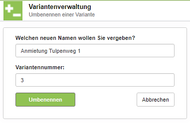 WiBe schlägt automatisch Bezeichnungen vor (Variante 1, 2 usw.). Mit ‘Umbenennen’ können Sie diese Vorschläge durch eigene Bezeichnungen überschreiben. Geben Sie in das Feld ‘Name’ den neuen Namen ein (im Feld wird der aktuelle Name angezeigt). Klicken Sie auf die Schaltfläche 'Umbenennen', die WiBe kehrt dann zurück zur Variantenverwaltung.